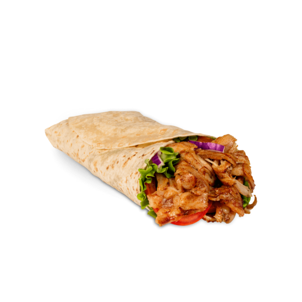 Galette de blé, viande de kebab, salade, tomates, oignons, sauce blanche