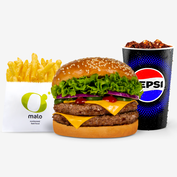 Malo Burger : Pain burger, 2 steaks de 100g, salade, tomates, oignons, cheddar, sauce Malo