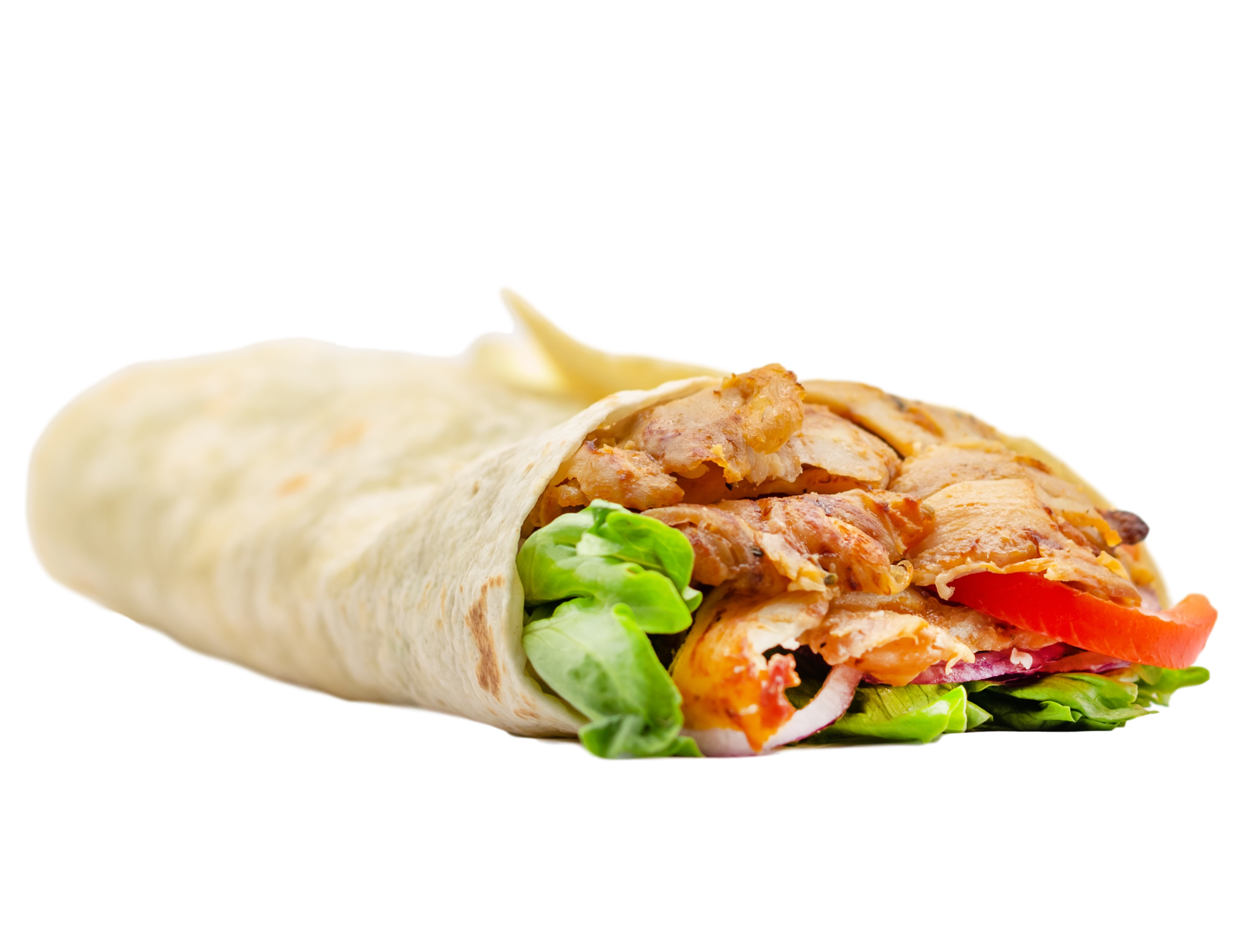 Crêpe, viande de kebab, salade, tomates, oignons, sauce au choix